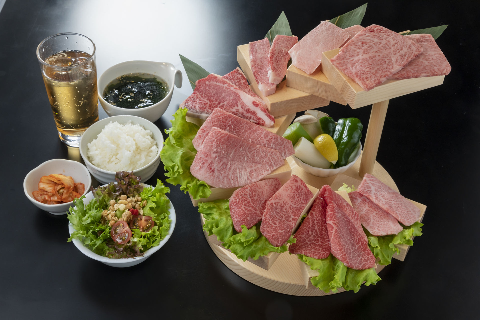 おすすめランチ【8種段盛りランチ《奏-かなで-》】 アミュプラザくまもと店 人気No.1のおすすめランチ 8種段盛りランチ《奏-かなで-》3300円(税込) 農園サラダ・ライス・スープ・キムチ…熊本駅で高級焼肉ランチを味わうなら新鮮な地元産黒毛和牛が味わえる和牛焼肉LIEBEへ